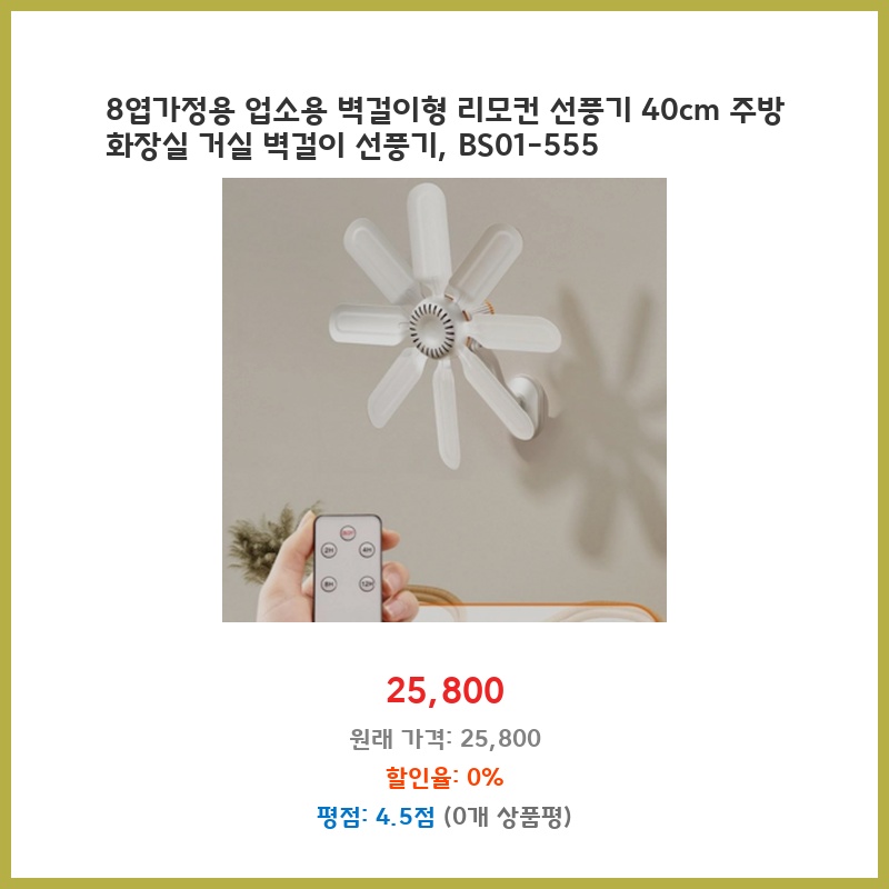 주방과 화장실 환기가 잘 안되어 습하고 더운데, 공간 절약과 효율적인 환기를 위해 벽걸이 선풍기를 찾았습니다. 8엽 날개라 바람이 부드럽고, 리모컨 기능으로 편리하게 사용할 수 있어 구매했습니다. 가격도 적당한 편입니다.