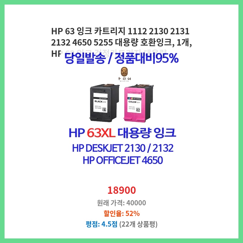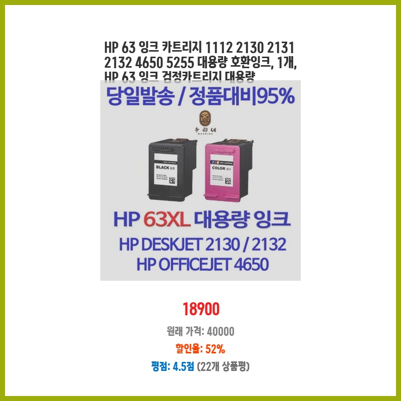 정품 대비 저렴한 가격에 대용량이라 경제적입니다. HP 63 잉크 호환 카트리지 여러 모델에 사용 가능하다는 점이 매력적이었고, 인쇄 품질도 만족스러울 것으로 예상됩니다.