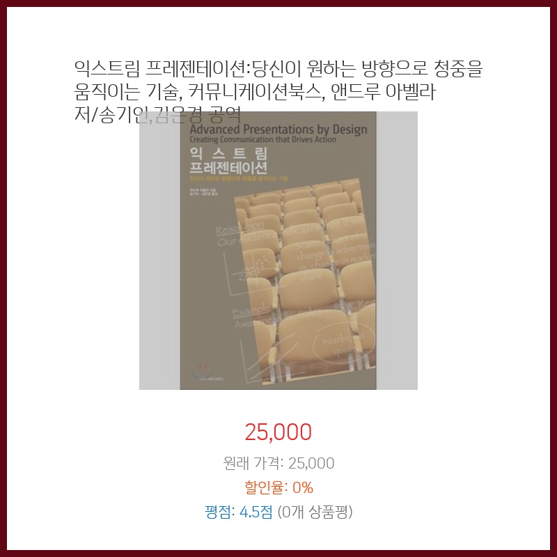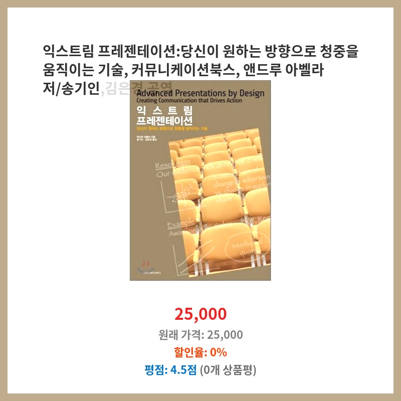 프레젠테이션 실력 향상을 위해 구매했습니다. 앤드루 아벨라의 명성과 실제 사례 중심의 구성이 매력적이었고, 구체적인 기술들을 배우고 싶었습니다. 책의 구성도 체계적이어서 학습에 도움이 될 것 같았습니다.