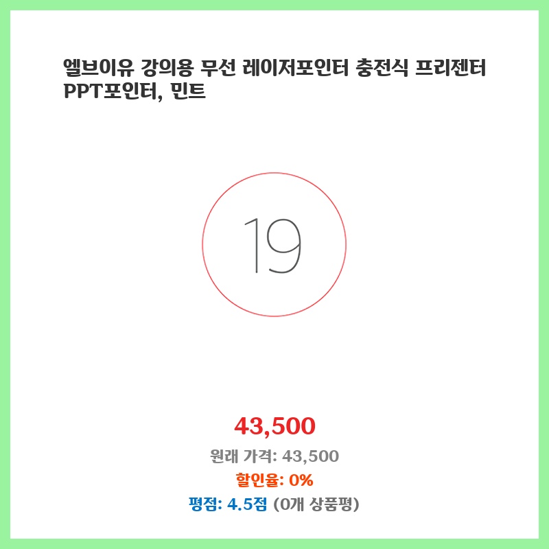 강의 시 깔끔한 디자인과 편리한 무선 기능이 마음에 들었습니다. 충전식이라 배터리 교체 걱정 없고, 레이저 포인터와 프리젠터 기능이 함께 있어 효율적입니다. 민트 색상도 산뜻해서 좋았습니다.