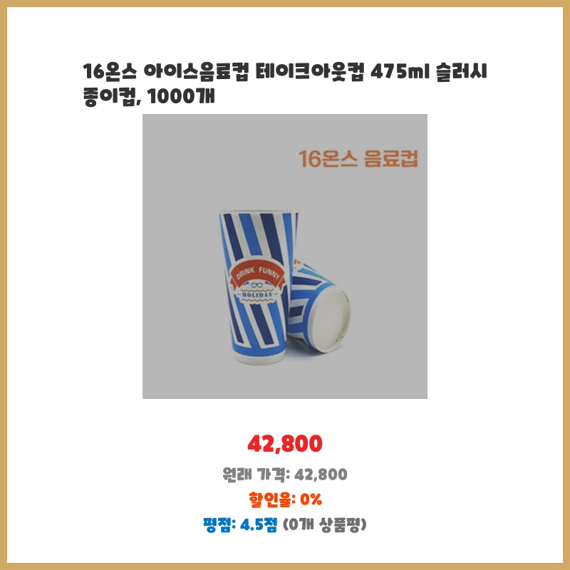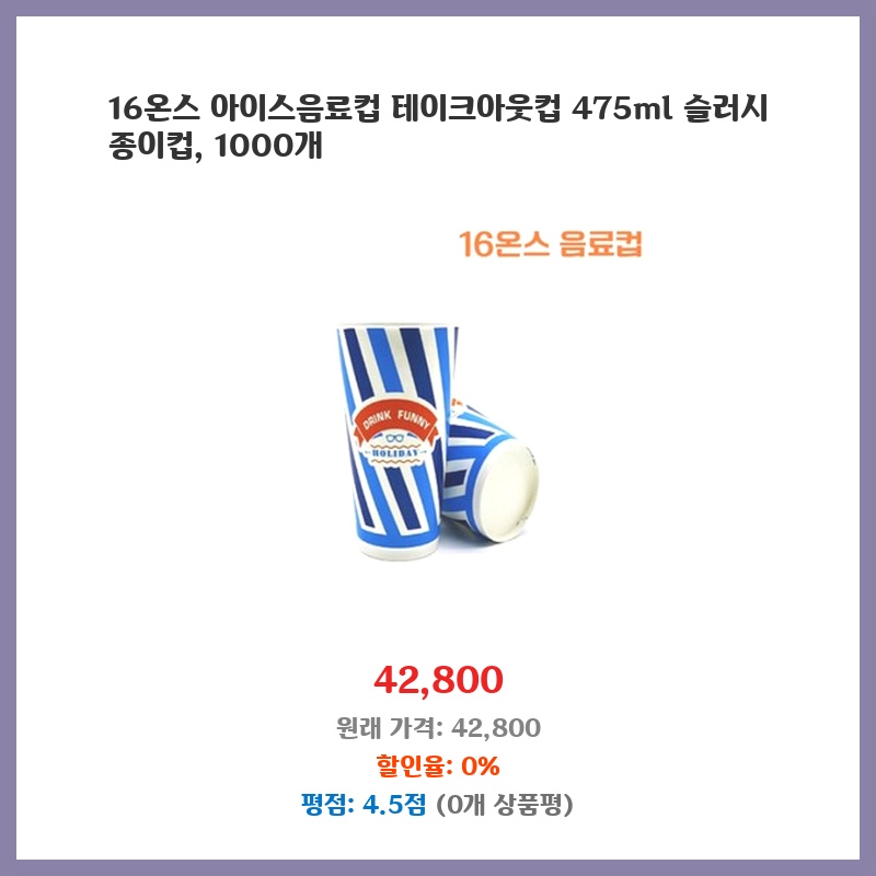 매장에서 사용할 아이스 음료컵이 필요했는데, 1000개 대량 구매로 가격이 저렴하고 용량도 적당해서 선택했습니다. 슬러시에도 사용 가능하다고 해서 더욱 좋았습니다. 종이컵이라 처리도 편리할 것 같습니다.