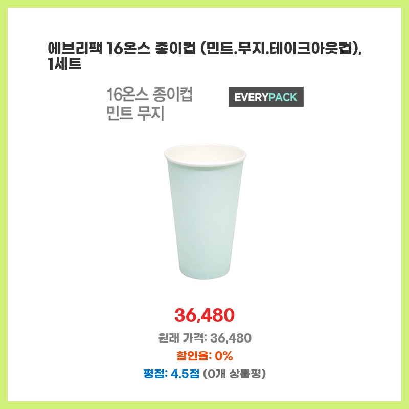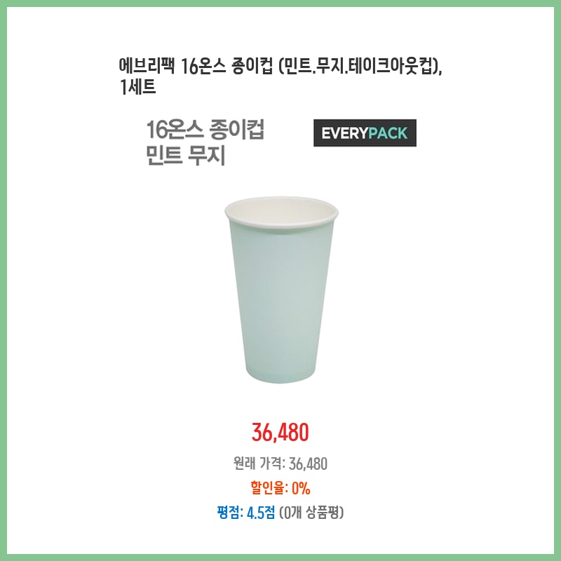 에브리팩 16온스 종이컵 (민트.무지.테이크아웃컵), 1세트