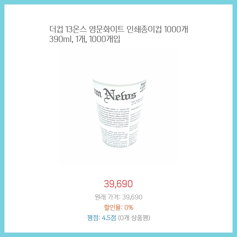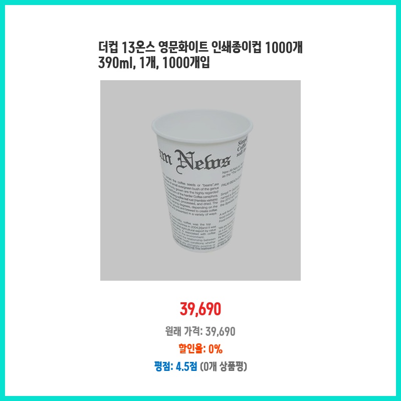 행사용으로 1000개 종이컵이 필요했는데, 가격 대비 용량이 넉넉하고 인쇄도 깔끔해서 선택했습니다. 무엇보다 13온스(390ml)라 여유로운 용량이 마음에 들었습니다.