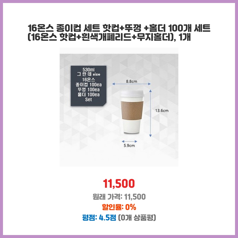 행사용으로 100개 세트가 필요했는데, 컵, 뚜껑, 홀더가 모두 포함된 구성이라 편리했습니다. 가격도 저렴하고 16온스 용량이라 충분한 양을 담을 수 있어 좋았습니다. 흰색 뚜껑이 깔끔해 보였습니다.