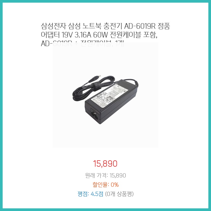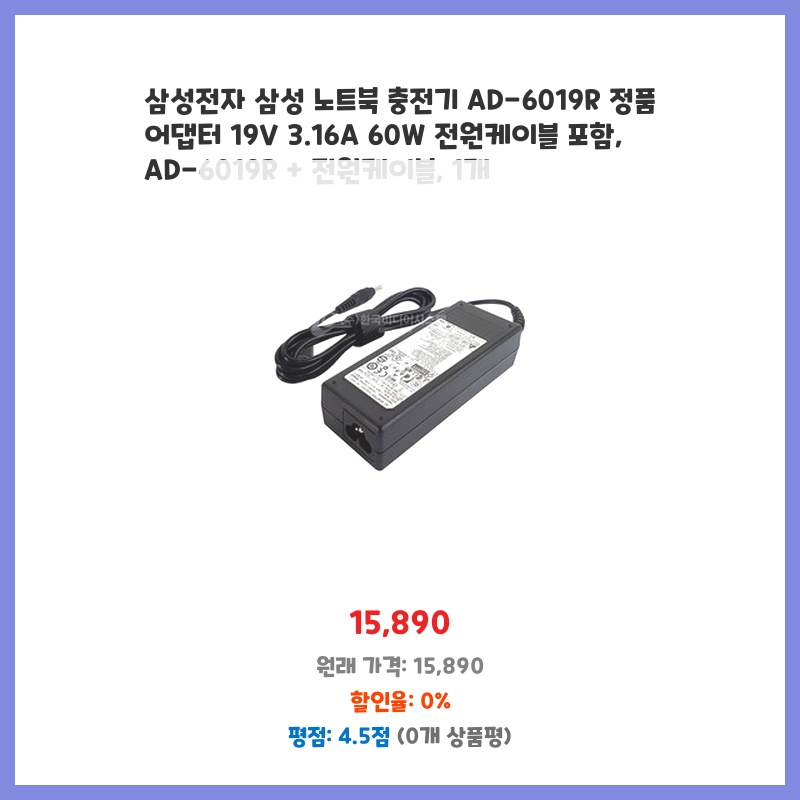 삼성전자 삼성 노트북 충전기 AD-6019R 정품 어댑터 19V 3.16A 60W 전원케이블 포함, AD-6019R + 전원케이블, 1개