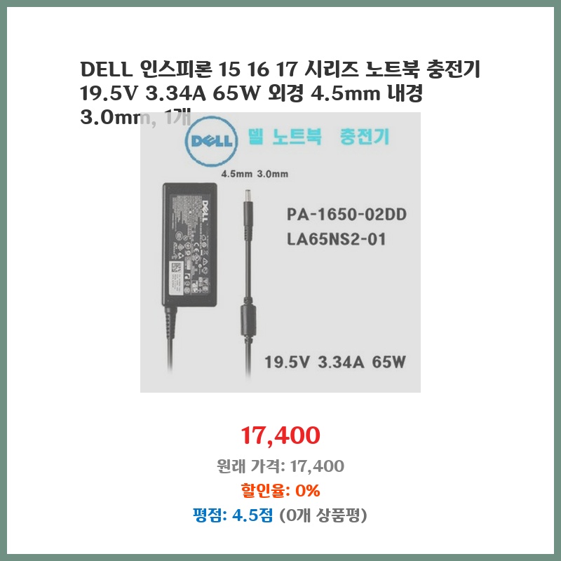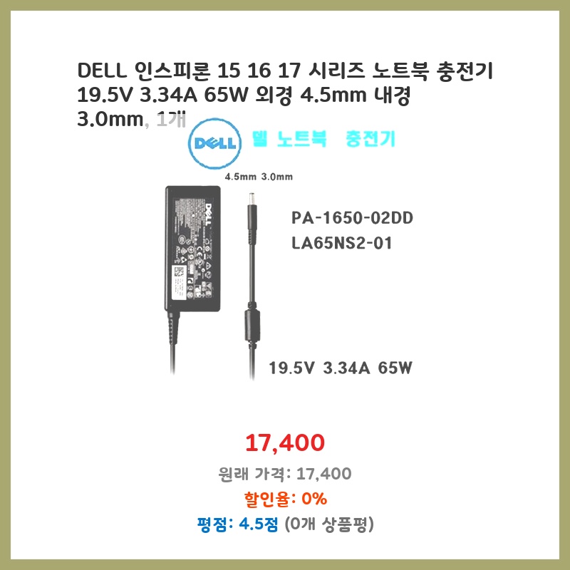 제품 설명에 명시된 사양(19.5V 3.34A, 4.5mm/3.0mm)과 일치하는 DELL 인스피론 15, 16, 17 시리즈 노트북에 호환됩니다. 모델명을 꼭 확인하세요.