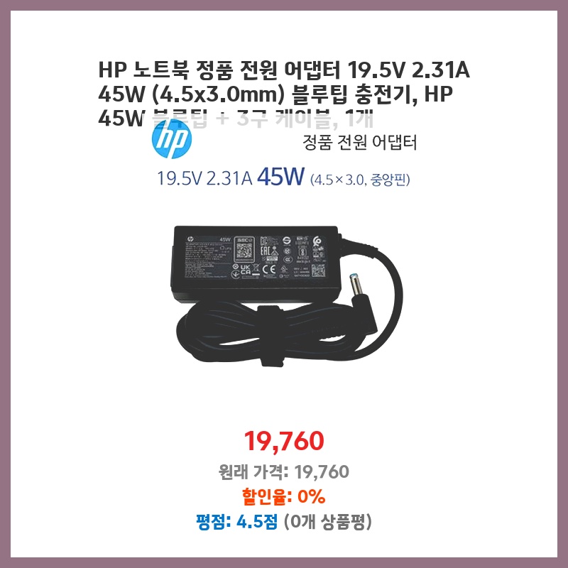 기존 어댑터 고장으로 노트북 사용이 불가능해져 정품 어댑터를 찾던 중 가격 대비 품질이 좋아 보여 구매했습니다. HP 노트북과 완벽하게 호환되고 안정적인 충전이 가능해서 만족합니다.