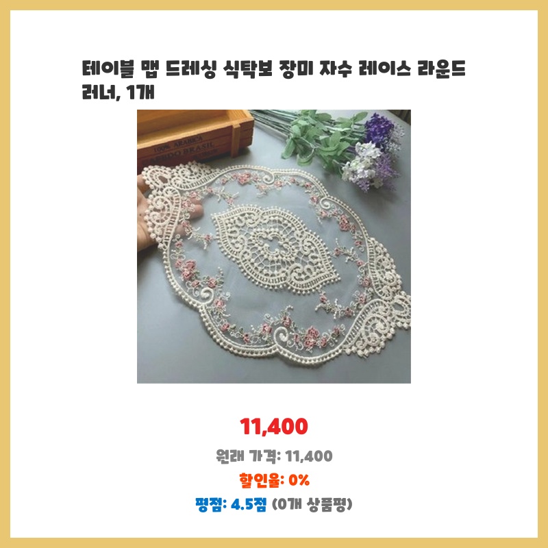 깔끔한 디자인과 고급스러운 자수가 마음에 들어 구매했습니다. 테이블이 더욱 화사해 보이고, 손님이 왔을 때도 분위기 연출에 좋을 것 같아요. 레이스 디테일도 예쁘고, 크기도 적당합니다.