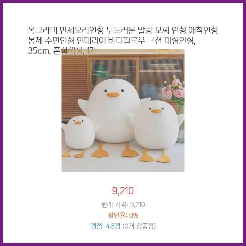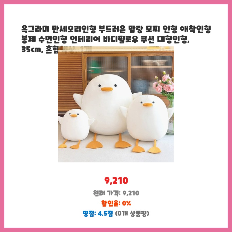 부드러운 소재와 귀여운 디자인에 반해 구매했습니다. 35cm 사이즈는 휴대하기에도 적당하고, 침대에 두고 수면 인형으로 사용하기에도 좋을 것 같아서 선택했습니다. 말랑말랑한 감촉이 스트레스 해소에도 도움될 것 같았습니다.