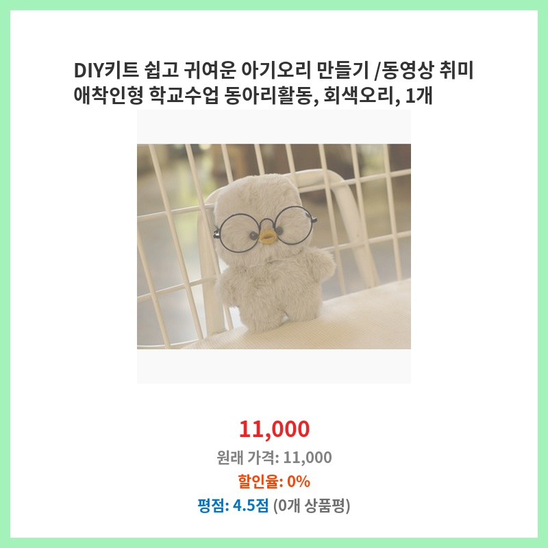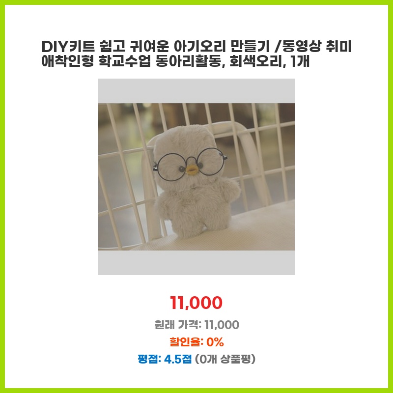 아이와 함께하는 취미 활동을 찾던 중, 귀여운 아기오리 인형을 직접 만들 수 있다는 점이 매력적이었습니다. 동영상 강의도 제공되어 초보자도 쉽게 따라 할 수 있을 것 같아 구매했습니다. 완성 후에는 애착 인형으로 사용할 수 있다는 점도 좋았습니다.